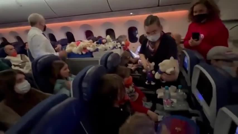 Poco antes de aterrizar en tierras españolas, los más pequeños recibieron una sorpresa. La tripulación les entregó peluches, mochilas y otros elementos con los colores Blaugrana que caracterizan al club Barcelona. Todos estos regalos fueron donados especialmente por el conjunto catalán para los recién llegados al país.