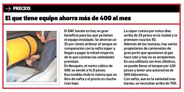 210 pesos se necesitan para llenar un tanque de GNC en Neuquén. Hoy la relación con el precio de la nafta es de dos a uno y hace tres años era de tres a uno.