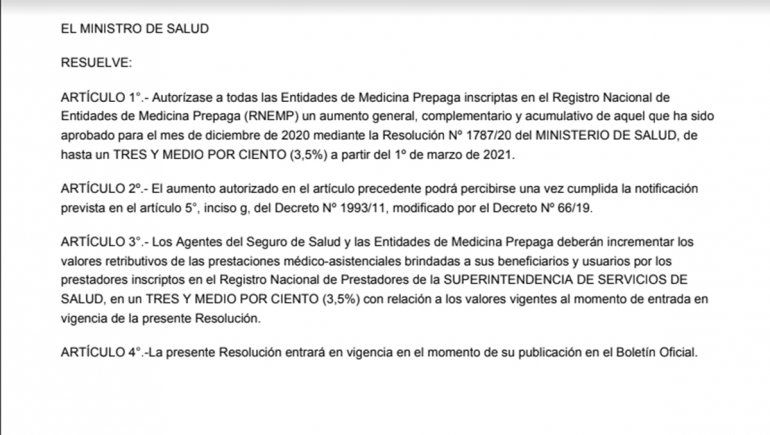 "Autorízase a todas las Entidades de Medicina Prepaga inscriptas en el Registro Nacional de Entidades de Medicina Prepaga (RNEMP) un aumento general, complementario y acumulativo de aquel que ha sido aprobado para el mes de diciembre de 2020 mediante la Resolución Nº 1787/20 del Ministerio de Salud, de hasta un tres y medio por ciento (3,5%) a partir del 1º de marzo de 2021", señaló el artículo primero de la resolución.