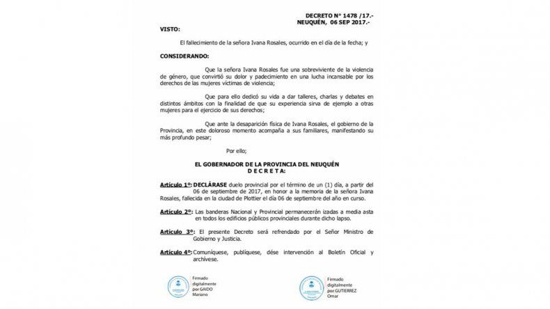 Con la firma del gobernador Omar Gutiérrez, el Gobierno estableció por decreto un día de duelo provincial en honor a la memoria de Ivana Rosales.