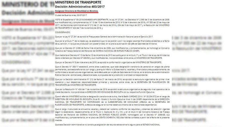 El Gobierno designó hoy a la Directora de Movilidad en Bicicleta, en el ámbito del ministerio de Transporte., en una medida oficializada a través de la Decisión Administrativa 483/2017 publicada este jueves en el Boletín Oficial con la firma del jefe de Gabinete Marcos Peña y del ministro de Transporte, Guillermo Dietrich.