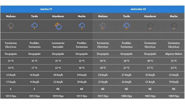 Por su parte, la capital provincial se vio cubierta desde entrada la tarde del martes por una nubosidad espesa que a los pocos minutos se convirtió en fuertes chubascos. La previsión anunciada por la AIC habla de un también aguacero considerable, recién, para la tarde noche del miércoles. Desde la AIC confirmaron que "se está formando" un frente que podría adelantar las precipitaciones en la región.