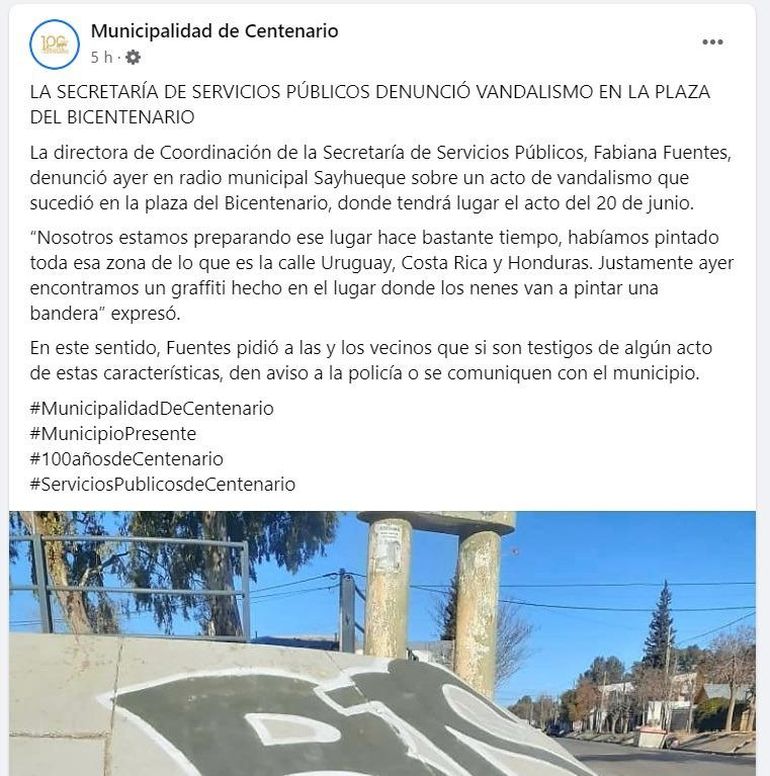Desde la Municipalidad de Centenario realizaron una denuncia por vandalismo en la Plaza del Bicentenario. Allí, un grupo de jóvenes del sector realizó un graffiti en honor a un popular grupo de K-Pop, que hasta cuenta con un club de fans en la ciudad.