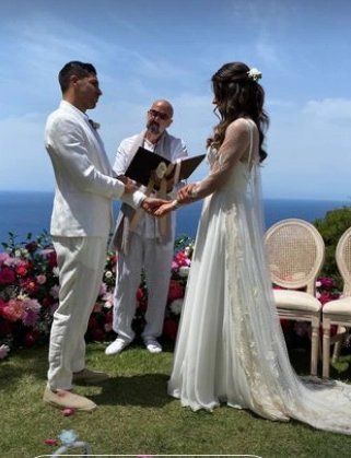 La celebración se dispuso en medio de un marco natural maravilloso, al aire libre (Europa transita el momento de mayor esplendor de la primavera y poco a poco va superando la segunda ola de covid gracias a una vacunación masiva) y envuelta en un clima de alegría y felicidad. Muchas de las imágenes dan cuenta de que la ceremonia tuvo lugar en un peñasco paradisíaco con vista al mar.