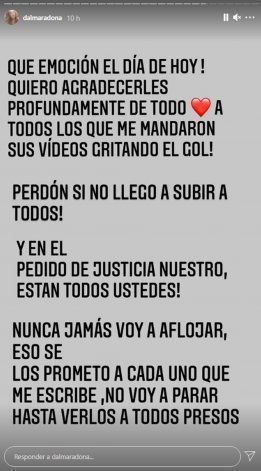 Por su parte, Dalma hizo lo propio en su cuenta de Instagram, donde escribió, “qué emoción el día de hoy, quiero agradecerles profundamente de todo corazón”. La hija mayor de Diego Maradona y Claudia Villafañe también aprovechó la oportunidad para involucrar a los fanáticos del futbolista en la causa que investiga su muerte y aseguró, “en el pedido de Justicia están todos ustedes”.