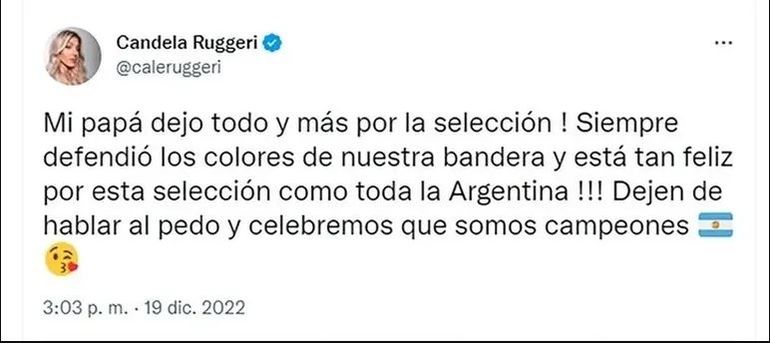 Por otro lado, recordemos que Cande festejó como cada uno de los 45 millones de argentinos el título obtenido por la Selección Argentina en la Copa del Mundo, en un mundial que terminó siendo épico por la gesta de la albiceleste y de Lionel Messi. Sin embargo, también pasó un mal momento por la cantidad de críticas duras que recibió Oscar Ruggeri, su padre, tras la consagración argentina.