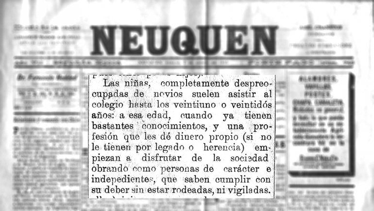 El 7 de agosto de 1915, la pequeña comunidad que crecía en el medio del desierto se sorprendió con un artículo publicado en el diario Neuquén, dirigido por el periodista Abel Chaneton, donde se arengaba a las mujeres locales a luchar contra esos estereotipos y a vivir una vida feliz e independiente más allá de los hombres.