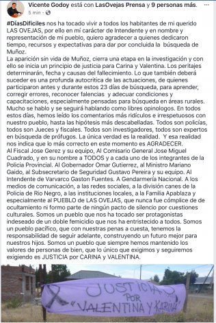 "Días difíciles nos ha tocado vivir a todos los habitantes de mi querido Las Ovejas, por ello en mi carácter de intendente y en nombre y representación de mi pueblo, quiero agradecer a quienes dedicaron tiempo, recursos y expectativas para dar por concluída la búsqueda de Muñoz", afirma el intendente en la primera parte del mensaje.