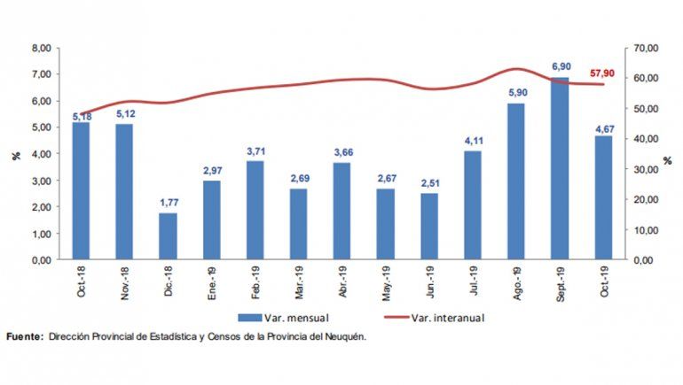 En octubre el índice de precios al consumidor registró un aumento de 4,67% mensual y acumuló una suba de 47,60% con respecto a diciembre de 2018, según lo que informó la Dirección de Estadísticas y Censos de la Provincia.