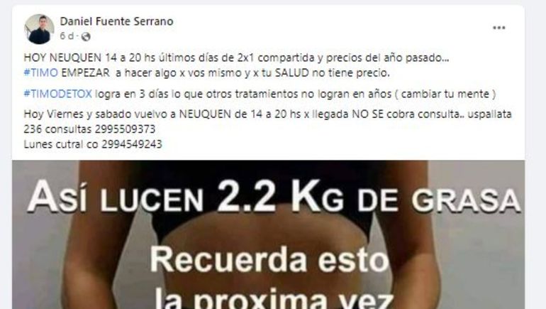 Lo cierto es que a pesar de las causas en su contra, una que incluyó a una mujer de Rincón de los Sauces que sufrió graves secuelas y terminó por perder su ombligo, Fuente Serrano continúa ofreciendo sus servicios en la región, incluso dedicando días específicos para ofrecer turnos de consulta en localidades como Roca, Catriel, Cutral Co o Añelo. Así al menos lo evidencia la actividad reciente en su página de Facebook, donde se mezclan publicaciones tanto de índole personal como laboral.