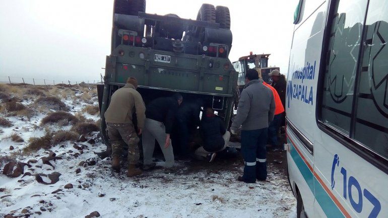 En la ruta provincial 13, entre Zapala y Primeros Pinos, un camión del Ejército volcó por la presencia de nieve y hielo. El vehículo transportaba una decena de soldados voluntarios de la Compañía de Cazadores de Montaña 6. Los mismos iban camino a Zapala.