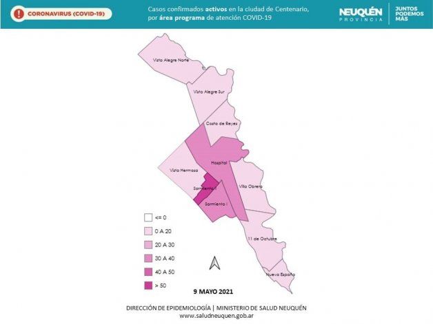 La localidad de Centenario, en cambio, presenta un menor número de casos en la cuenta total, pero con una mayor concentración. El área Sarmiento II tiene más de 50 contagios activos, mientras que las zonas Sarmiento I y Hospital tienen entre 40 y 50 casos cada una. El resto de los sectores, en cambio, presentan entre 20 y 30 casos.