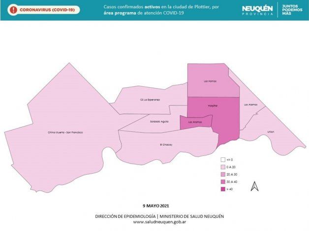 Los sectores Alta Barda, San Lorenzo, Villa Ceferino, Unión de Mayo, Terrazas de Neuquén, Melipal, Islas Malvinas, Río Grande y Limay tienen entre 40 y 60 casos. Por otro lado, Provincias Unidas, Mariano Moreno, Don Bosco I y II, Área Centro Sur, Valentina Rural, Altos del Limay, Villa María, Villa Florencia y Gran Neuquén concentran entre 20 y 40 casos cada uno.
