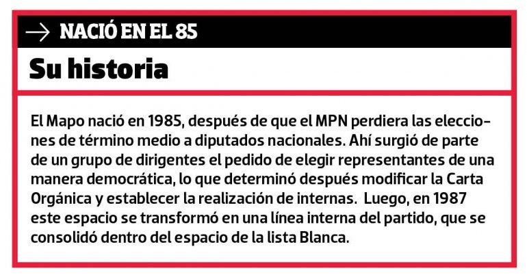 El Mapo, grupo de discusión política dentro del Movimiento Popular Neuquino (MPN), que surgió a mediados de la década del 80 y que ahora volvió a cobrar fuerza de la mano de algunos dirigentes, presentará un documento de trabajo en la reunión convocada por la Convención y la Junta de Gobierno para el 16 de este mes, en las que se propondrá “relanzar” al partido provincial.