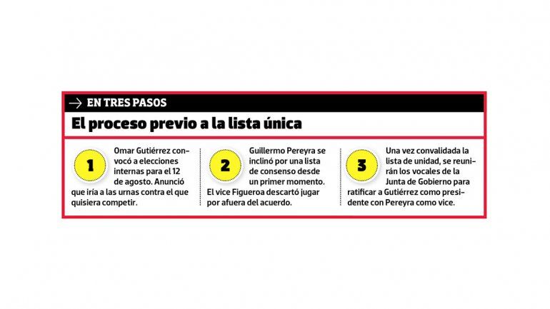 El acuerdo implica la reelección de Gutiérrez como presidente de la Junta de Gobierno del MPN, con Pereyra como vice. La Convención del partido será presidida por el intendente de Villa Pehuenia, Sandro Badilla. El desplazado del acuerdo fue el vicegobernador, Rolando Figueroa, quien amagó con enfrentar a la conducción del espacio por el que se proyectó, pero al final optó por mantenerse al margen de la contienda, con lo cual cederá la titularidad de la Convención que por ahora ostenta.