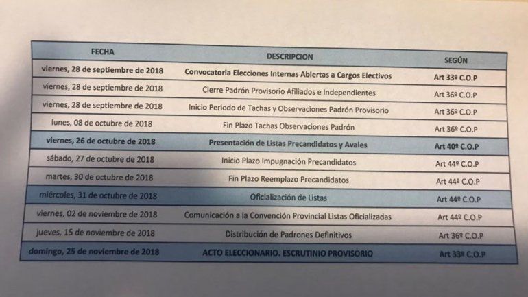 De acuerdo al cronograma electoral la presentación de listas vence el 26 de octubre. Según el padrón electoral, están en condiciones de votar 420 mil personas. Podrán votar afiliados e independientes.