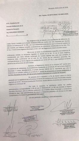 En la misiva, los concejales destacan que el decreto 328/18, mediante el cual el intendente Horacio Quiroga produjo el veto, remite al artículo N° 76 de la Carta Orgánica Municipal, que determina claramente que “si el Concejo Deliberante lo confirmase con el voto de dos tercios de los miembros presentes pasará, convertido en ordenanza, al órgano ejecutivo para su publicación”.