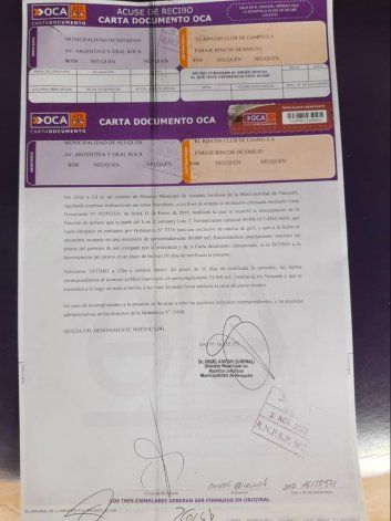 En el escrito, les recuerdan a los administradores de Rincón Club que existe una intimación previa, del 31 de enero de 2019, para que liberen el terreno que está dentro del área protegida Bardas Norte. A continuación, indican que, “encontrándose ampliamente vencidos los plazos del permiso de uso otorgado por la ordenanza y de la carta documento referenciada, se lo intima a la desocupación el mismo en un plazo de 30 días de notificada la presente”.