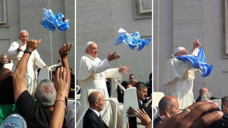 "Quise entregarle la bandera, pero resultaba muy difícil por las medidas de seguridad que hay. Así que decidí tirarle la bandera, que es lo que se ve en las fotos", dijo Ahmed, y agregó que en la misa posterior que se celebró en Roma, con Francisco a cargo, logró bendecir la otra bandera que había llevado desde Neuquén.