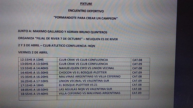 "Es un torneo que organiza la Filial de River, ya están los equipos organizados, no es que es una prueba abierta. Hoy son categoría 2008, 2009 y 2010. Están hoy y mañana sábado es acá", agrega el directivo de la entidad capitalina.