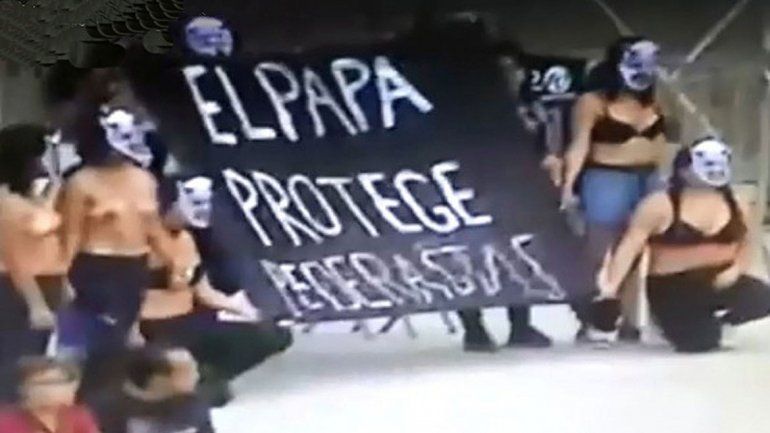 Un grupo de mujeres realizó una protesta contra el papa Francisco frente a la Catedral de Lima, según imágenes de un video en Facebook. Con el torso desnudo y portando máscaras, las manifestantes exhibieron una bandera con un mensaje contra el sumo pontífice, que ayer a la tardecita llegó a Perú en una visita que se extenderá hasta el domingo 21 y que incluirá las ciudades de Puerto Maldonado y Trujillo. Las mujeres lucieron una bandera con el mensaje “El Papa protege a los pederastas”.