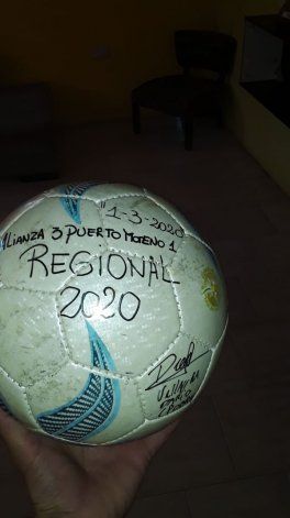 1-3-2020. Alianza 3-Puerto Moreno 1. Regional 2020. Villagra Darío (Pobre). Eso se lee en el balón que Darío Villagra se llevó a su casa tras su resonante hat-trick ante los de Bariloche el pasado domingo. Fue su primer hat trick en torneos federales.