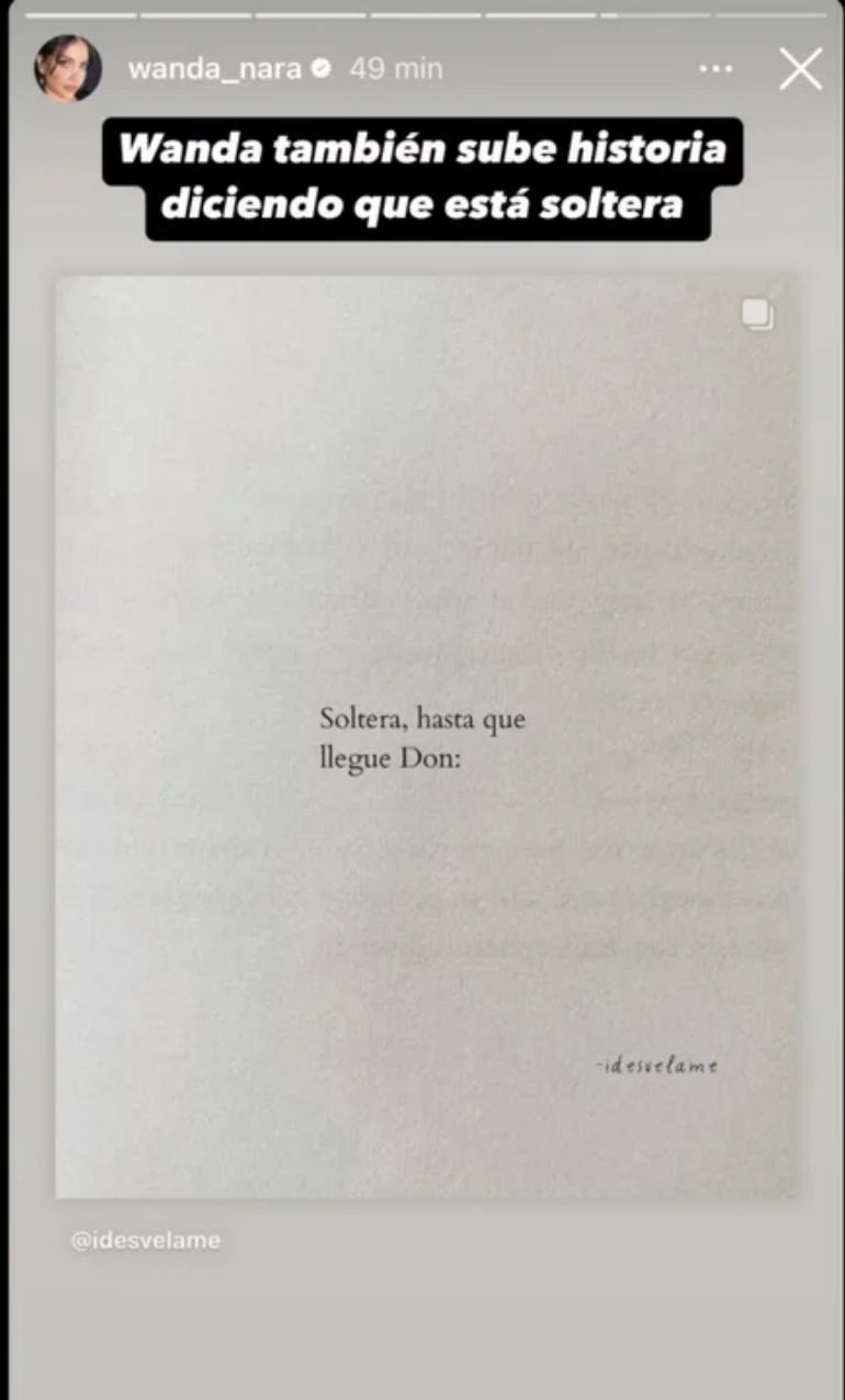 El posteo de Wanda comenzó con una frase que rápidamente llamó la atención: “Soltera, hasta que llegue Don...”, dando a entender que su corazón está cerrado por ahora, pero abierto a la posibilidad de una nueva relación si aparece el hombre indicado. La publicación fue vista como una respuesta a los rumores de reconciliación con su expareja, Icardi, y también coincidió curiosamente con un mensaje similar que horas antes había compartido la China Suárez, lo que hizo que sus seguidores comenzaran a especular aún más sobre la vida amorosa de la mediática.