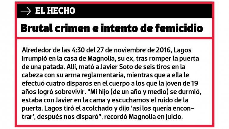 Alrededor de las 4:30 del 27 de noviembre de 2016, Lagos irrumpió en la casa de Magnolia, su ex, tras romper la puerta de una patada. Allí, mató a Javier Soto de seis tiros en la cabeza con su arma reglamentaria, mientras que a ella le efectuó cuatro disparos en el cuerpo a los que la joven de 19 años logró sobrevivir. “Mi hijo (de un año y medio) se durmió, estaba con Javier en la cama y escuchamos el ruido de la puerta. Lagos tiró el acolchado y dijo ‘así los quería encontrar’, después nos disparó”, recordó Magnolia en juicio.