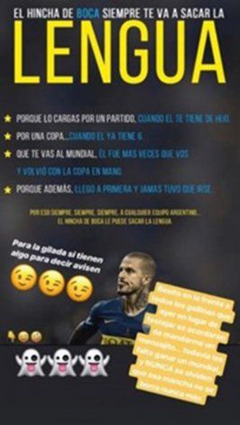 "El hincha de Boca siempre te va a sacar la lengua. Porque lo cargas por un partido, cuando te tiene de hijo. Por una copa, cuando él ya tiene seis. Que te vas al Mundial, él fue más veces que vos y volvió con la Copa en la mano. Porque además, llegó a Primera y jamás tuvo que irse. Por eso siempre, siempre, siempre, a cualquier equipo argentino… el hincha de Boca le puede sacar la lengua", escribió Pons en Instagram.