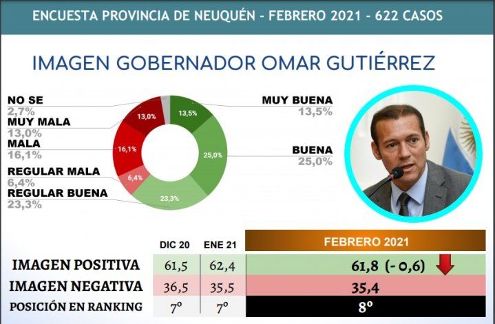 Desde que se realiza el “Ranquin interprovincial de imagen positiva”, Omar Gutiérrez se mantiene entre los diez gobernadores con mayor aceptación. Este mes, retrocedió un casillero, del séptimo al octavo puesto, aunque conserva un 61,8 por ciento de popularidad.