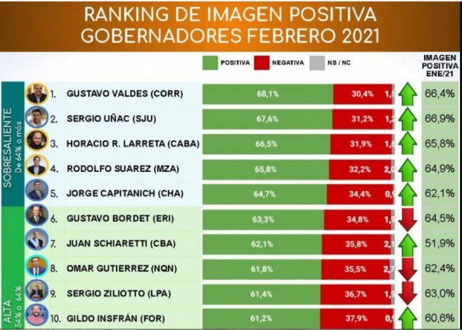 El gobernador más popular según el sondeo de febrero es el correntino Gustavo Valdés, seguido por el sanjuanino Sergio Uñac y el porteño Horacio Rodríguez Larreta. El cuarto puesto es para Rodolfo Suárez de Mendoza y luego vienen el chaqueño Jorge Capitanich, el entrerriano Gustavo Bordet, el cordobés Juan Scharetti y el mandatario neuquino.