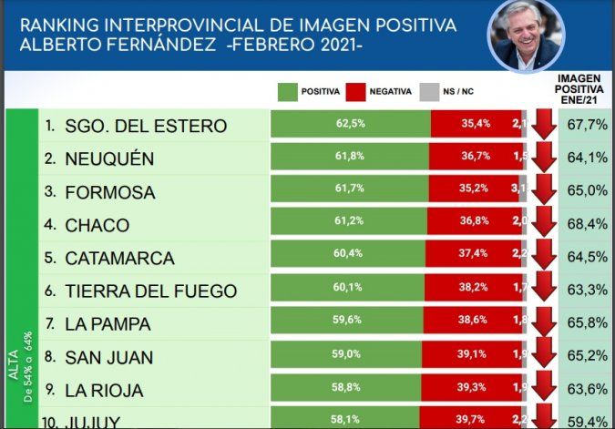 En la mayoría de las provincias, la popularidad de Fernández cayó para este último sondeo. Sólo Tucumán, Misiones, Chubut y Santa Cruz mostraron un incremento de su imagen positiva. Sin embargo, las cuatro se mantienen en la mitad de la tabla, con un respaldo al presidente que oscila entre el 54 y el 57 por ciento de los encuestados.