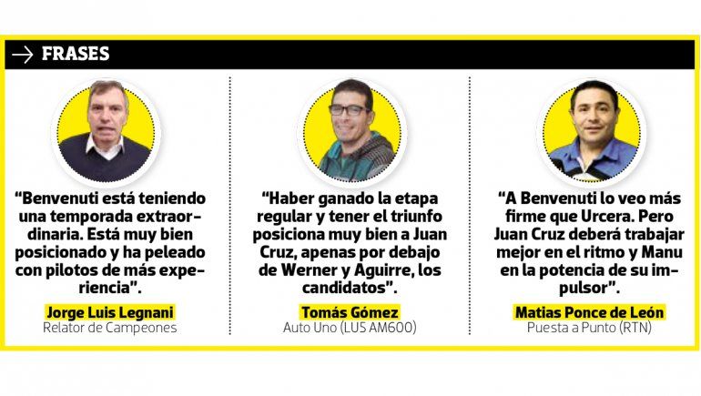 En el lance ven al neuquino Juan Cruz Benvenuti (Torino) con más chances que el cipoleño José Manuel Urcera (Chevrolet) y ubican a Mariano Werner (Ford) como el principal favorito, sin descartar a Valentín Aguirre (Dodge) y mucho menos al último campeón, Agustín Canapino (Chevrolet).