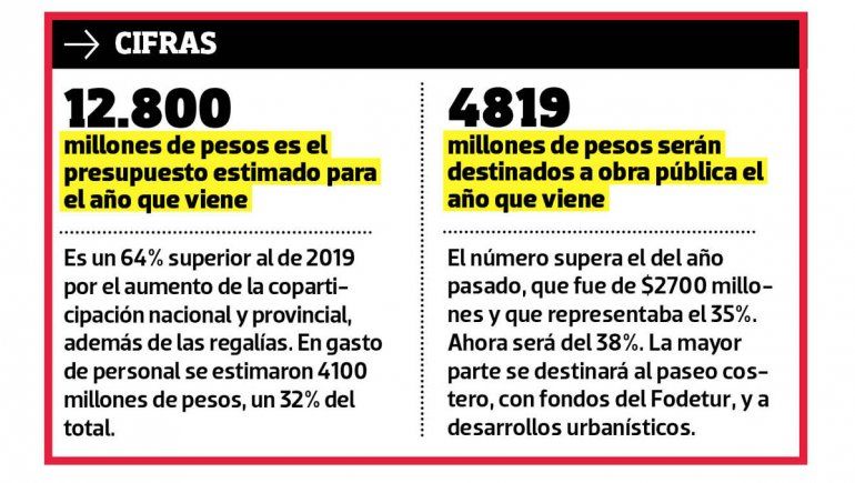 Sobre el plan de obra pública previsto, hay $28 millones destinados al paseo costero, con fondos del Fodetur. Para desarrollos urbanísticos se asignarán $439.705.000, de los cuales el asentamiento de toma Pacífica se llevará $223 millones, y después se plantean otras como urbanización en sectores de Confluencia $14.605.000, asentamiento Alto Godoy $49 millones, asentamiento 26 de Agosto $79 millones y Cañadón Hibepa $51 millones.