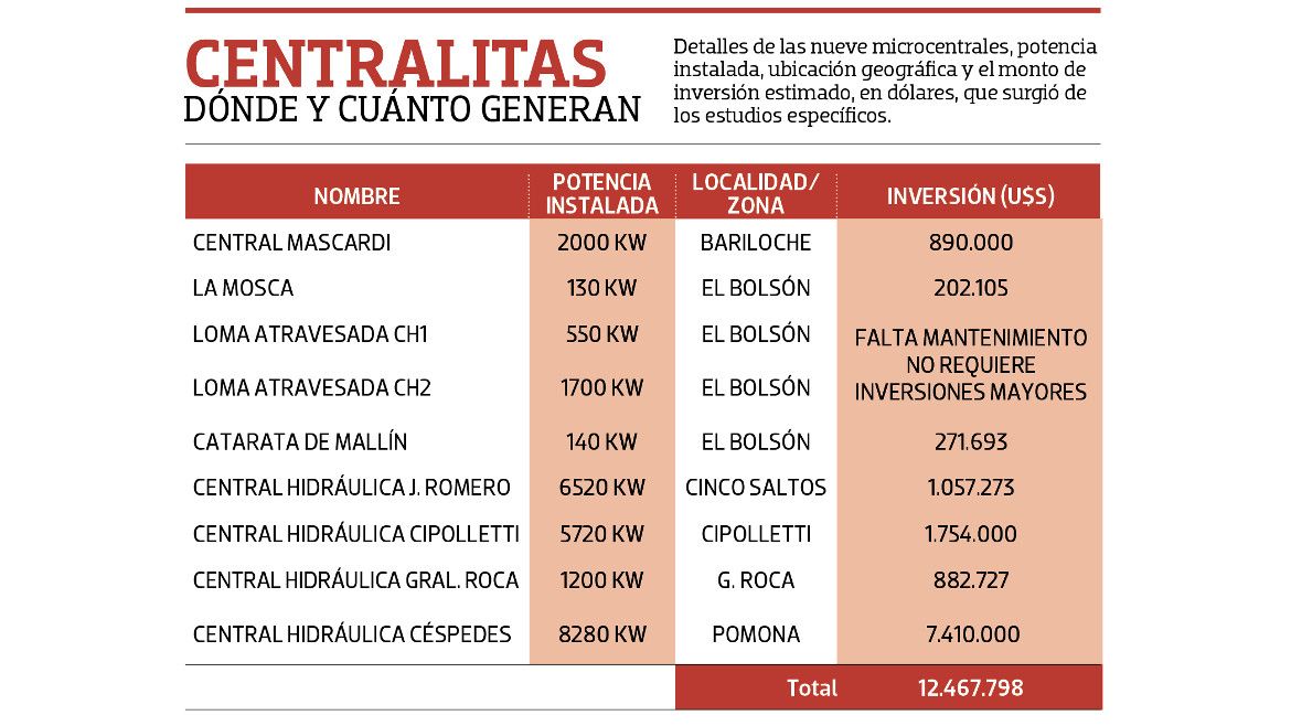 La empresa estimó en 5 y 6 millones de dólares la inversión proyectada para desarrollar una minihidroeléctrica con 1,8 MW de potencia instalada. “La nuestra es una empresa hecha a pulmón, habíamos buscado inversores, interesados, trabajamos mucho, realizamos estudios, juntamos documentación..., pero quedamos fuera”, explicó.