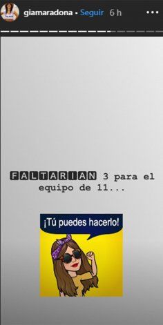 Teniendo en cuenta la cantidad, Gianinna Maradona hizo un sarcástico posteo en su cuenta de Instagram. "Faltarían tres para el equipo de 11. Tu puedes hacerlo", publicó en una storie en su perfil.