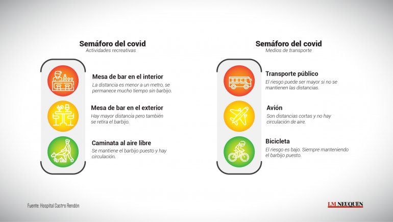 A partir de la flexibilización de las actividades económicas y recreativas que rompieron con el aislamiento estricto, los neuquinos comenzaron a salir a las calles para trabajar, consumir y entretenerse. Con la pandemia aún presente, cada salida al exterior supone distintos niveles de riesgo de contagio de coronavirus, por lo que LM Neuquén elaboró un semáforo que clasifica la peligrosidad de las situaciones cotidianas.