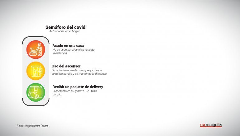 Según datos aportados por el Hospital Castro Rendón, las actividades diarias implican un riesgo que varía según el tiempo de permanencia en cada espacio, el respeto de las distancias mínimas y el tipo de encuentro que se mantiene con los demás. Por eso, no es lo mismo recibir un paquete de delivery, en un contacto que se sostiene por apenas segundos, que encontrarse a compartir un asado por varias horas.
