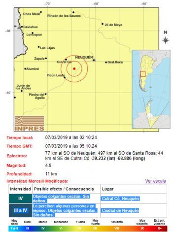 El sismo en Neuquén tuvo una magnitud de 4.8 en la escala de Ritcher, se dio a una profundidad de 11 kilómetros a 77 km. al suroeste de Neuquén y 44 km. al sureste de Cutral Co.