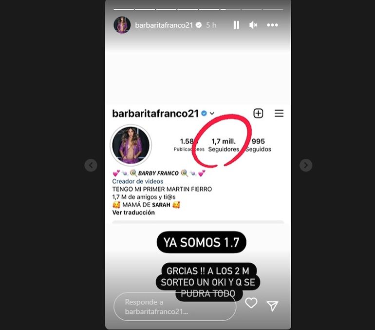 “Si llegamos a los 2 millones sorteo un 0km”, publicó la novia de Fernando Burlando emocionada. De hecho, Franco decidió hacer algunas modificaciones en su perfil de la red social y al superar el millón y medio de seguidores en la red social optó por escribir: “1,7 M de amigos y ti@s”.