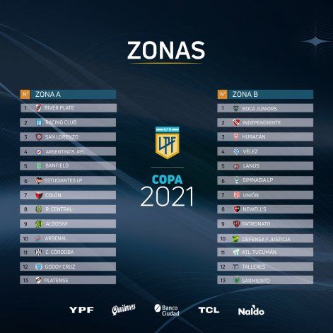 La Zona A estará conformada por River, San Lorenzo, Argentinos, Platense, Rosario Central, Central Córdoba, Arsenal, Racing, Banfield, Estudiantes, Colón y Godoy Cruz. La B, en tanto, contará con Boca, Vélez, Sarmiento de Junín, Newell’s, Huracán, Atlético Tucumán, Lanús, Patronato, Independiente, Defensa y Justicia, Gimnasia, Unión y Talleres.
