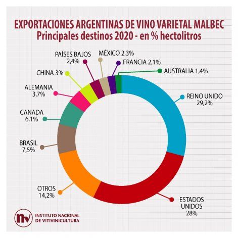 - Las exportaciones de este varietal han crecido en volumen un 57,4% y en valor un 19,9% con respecto al año 2011. El principal destino de los vinos varietales puros MALBEC en 2020 fue Reino Unido, seguido por Estados Unidos. Luego figuran Brasil, Canadá y Alemania. En tanto para el Malbec con cortes los principales destinatarios fueron: Reino Unido, Estados Unidos, Brasil, Colombia y Canadá.