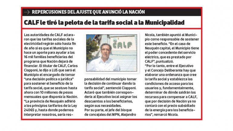 Para CALF, que continúe la tarifa social en enero dependerá del Municipio