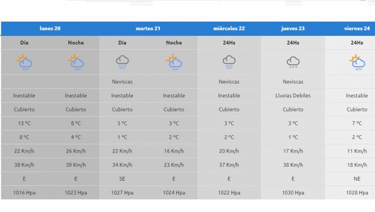 El pronóstico de la AIC para el martes anticipa neviscas en la región durante el día con tiempo inestable y cielo cubierto. Habrá un marcado descenso de las temperaturas, la máxima será de 4 grados y la mínima de un grado. Se hará sentir el frío en el Alto Valle. Hacia la noche descenderá a una máxima de 3 grados y una mínima de 2 grados. Se espera viento leve con ráfagas de 34 kilómetros por hora.