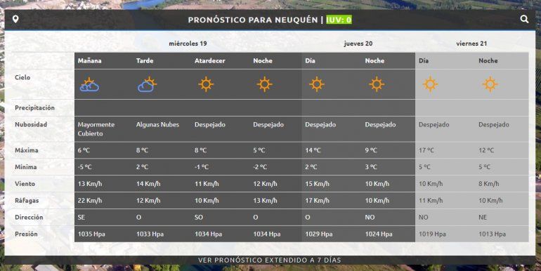 Estas condiciones se mantendrán durante los próximos días. Este jueves, la AIC pronosticó tiempo bueno, aire templado que ingresa del nor-noroeste y temperaturas en ascenso, que harán que el termómetro no baje de cero y la mínima estará en torno a los 2°C. La máxima podría llegar a 14 grados. El viernes estará despejado con registros térmicos entre los 5 y los 17 grado.
