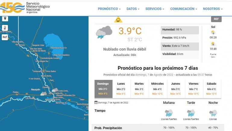El SMN pronosticó lloviznas con probabilidades entre el 10 y el 40% durante la madrugada y mañana del lunes. Recién hacia la tarde dejará de llover, con cielo estará mayormente nublado. Se irá despejando hacia la noche. La temperatura será baja. Por la madrugada estará en los 2 grados, por la mañana en los 3 grados y por la tarde alcanzará los 6 grados de máxima. Hacia la noche descenderá a los 5 grados y habrá viento leve en la región.