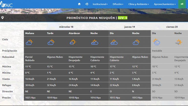 Según la Autoridad Interjurisdiccional de las Cuencas (AIC), por la mañana el cielo estará parcialmente nublado con una temperatura máxima de 11 grados y una mínima de cero grados. Por la tarde habrá algunas nubes y la temperatura máxima alcanzará los 15 grados; mientras que hacia la noche estará cubierto y la temperatura descenderá a una máxima de 10 y una mínima de 4 grados.