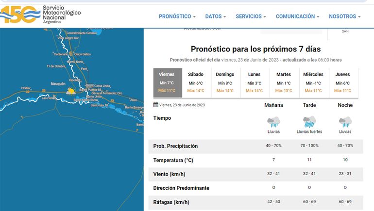 Para este viernes se esperan lluvias durante toda la jornada en Neuquén. El pronóstico anticipa lluvias por la mañana y noche, y lluvias fuertes por la tarde. Habrá un leve ascenso de la temperatura con una mínima de 7 grados y una máxima de 11 grados. Se anticipó viento fuerte con ráfagas de hasta 69 kilómetros por hora.