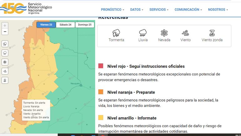 El SMN emitió, por segundo día consecutivo, una alerta naranja por lluvias en la franja cordillerana próxima al límite con el vecino país y un radio un poco más amplio de alerta amarilla también por lluvias.