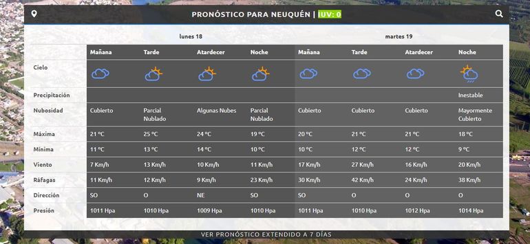 El pronóstico para el martes indica leve descenso de las temperaturas y viento en el Alto Valle. Durante el día el cielo estará cubierto y las temperaturas estarán entre una máxima de 22 y 14 grados. Por la noche el cielo estará despejado con una máxima de 16 y una mínima de 9 grados. Respecto al viento, provendrá del sector sudoeste, será leve con ráfagas entre los 44 y 53 kilómetros por hora.
